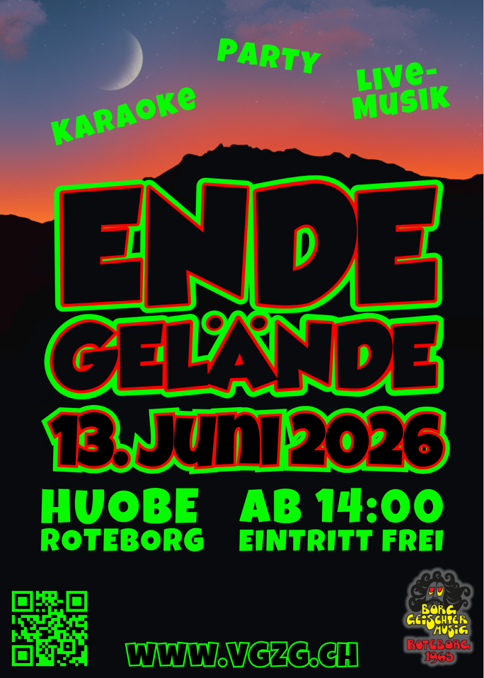 Feiere mit uns bis in die Nacht hinein am 13. Juni 2026 in der Huoben! Die vierte Ausgabe der Party ENDE GELÄNDE bietet etwas für jeden Geschmack. Mit klassischem Festzelt, gemütlichen Weingrottino, sonniger Cocktailbar, Karaoke-Erlebnis im Stall oder Live Musik auf der Wiese. Egal ob Jung oder Alt, komm vorbei denn der Eintritt ist frei!